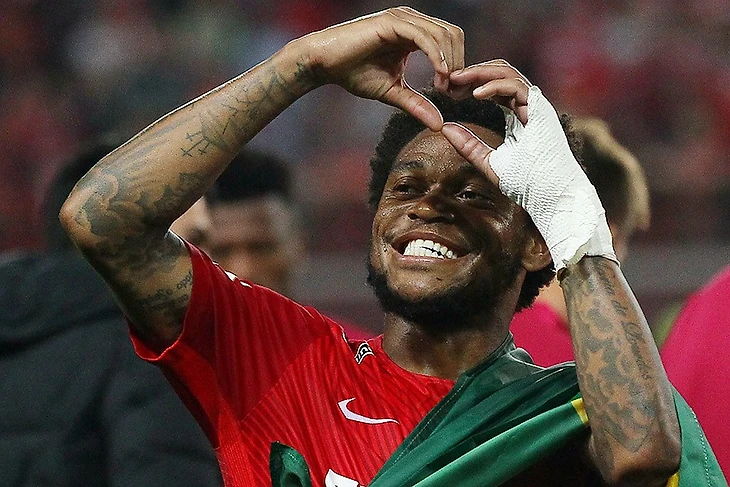Другой бразильский нападающий Луис Адриано вышел на поле с флагом и перебинтованной рукой.