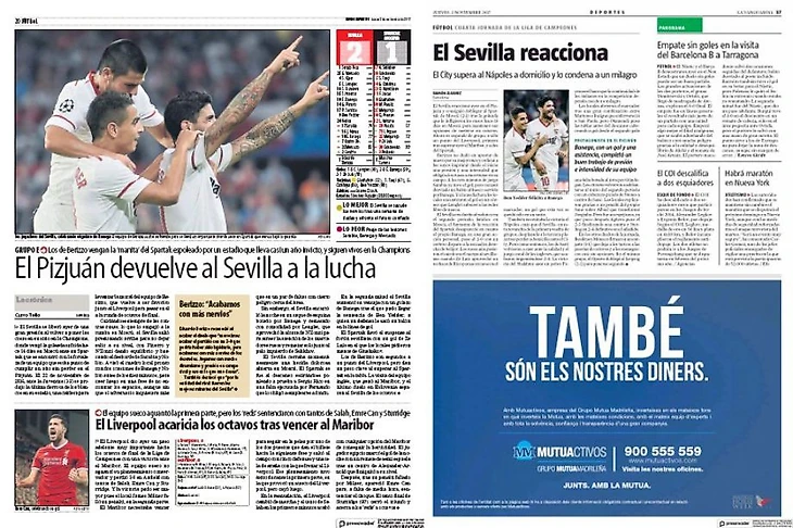 Заголовок в El Mundo Deportivo – «Севилья» вернулась на «Писхуан», чтобы дать бой». Ещё один материал, спрятанный в недрах общественно-политической газеты La Vanguardia – «Севилья» реагирует». На сайте издания повторяется заголовок про повод улыбнуться. «Испанская команда стала сильнее и не позволила «Спартаку» играть так, как ему вздумается», — констатирует автор заметки.