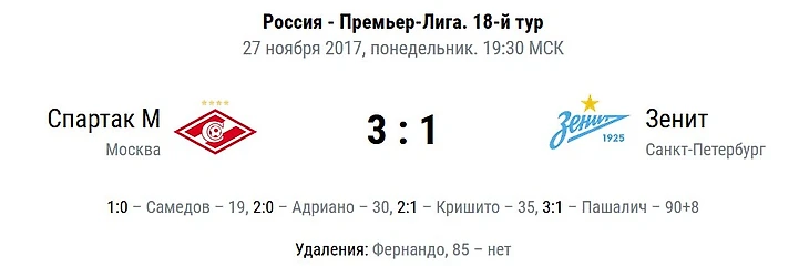 Финальный свисток уже «Спартак» встречал, как на войне. Где все средства хороши. Фернандо, срывая атаку «Зенита», откровенно рубил Дриусси и нарывался на красную карточку. Падал Зе Луиш. Просил помощь врачей Зобнин. Цеплялся за траву и падал Джикия. Селихов, выбивая мяч от ворот, семенил и тянул время ещё сильнее. В такой атмосфере «Зенит» сподобился лишь на навал, где сломался Дмитрий Комбаров, а «Спартак» – на третий гол. Фланг новоиспечённого правого защитника Жиркова порвали пасом вразрез, а Зе Луиш покатил мяч на пустые ворота Пашаличу – хорват обязан был забивать и ставить точку. «Спартак» теперь в двух очках от «Зенита» и в восьми – от первой строчки.