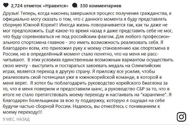 — В биатлоне нет политики, мы живём в дружбе. Мы с Олей давно встречаемся, и за эти годы ни одного вопроса плохого не задали. А про переход – мне просто очень хотелось выступать, я боялся потерять форму, потерять всё. И так почти полгода готовился самостоятельно, пока ждал согласия из Кореи.