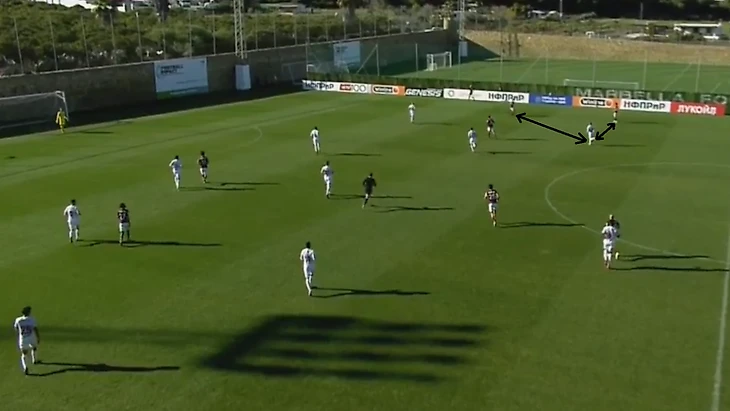 Изначально "Спартак" в Твиттере опубликовал расстановку, на которой Ханни располагался в центре. Но это не совсем так. Алжирец действительно значительную часть времени провел в середине поля за спиной Зе Луиша, но еще чаще находился на левом фланге. С этого края хавбек в середине первого тайма и ускорился, чтобы получить передачу Зобнина в штрафную. А еще на 5-й минуте Ханни с позиции центрфорварда прессинговал защитника, заставил того ошибиться, и отправил мяч в штангу.
