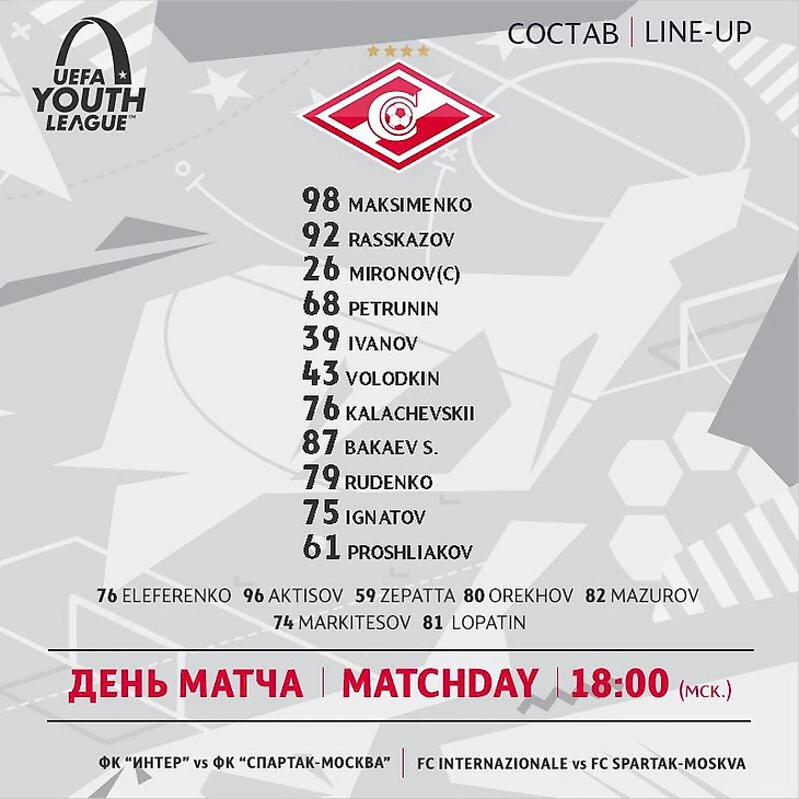 Стал известен состав красно-белых в матче плей-офф Юношеской лиги УЕФА.