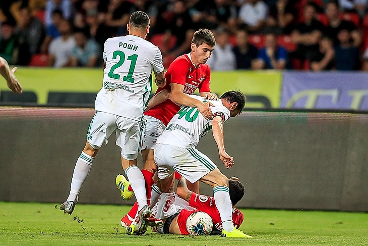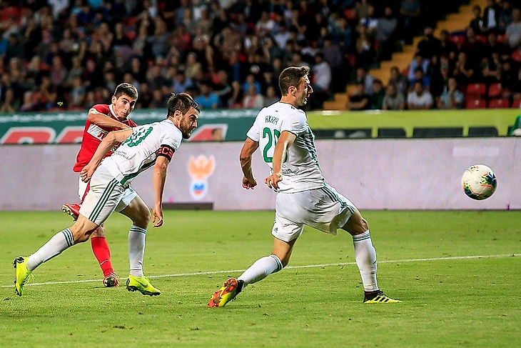 Первые полчаса прошли в вязкой позиционной борьбе. Обе команды попеременно владели инициативой, но по-настоящему опасных моментов было немного. Первый удар по нашим воротам нанес наш бывший футболист Глушаков — мимо ворот. У нас после навеса со «стандарта» бил головой Тиль — Городов оказался на месте.