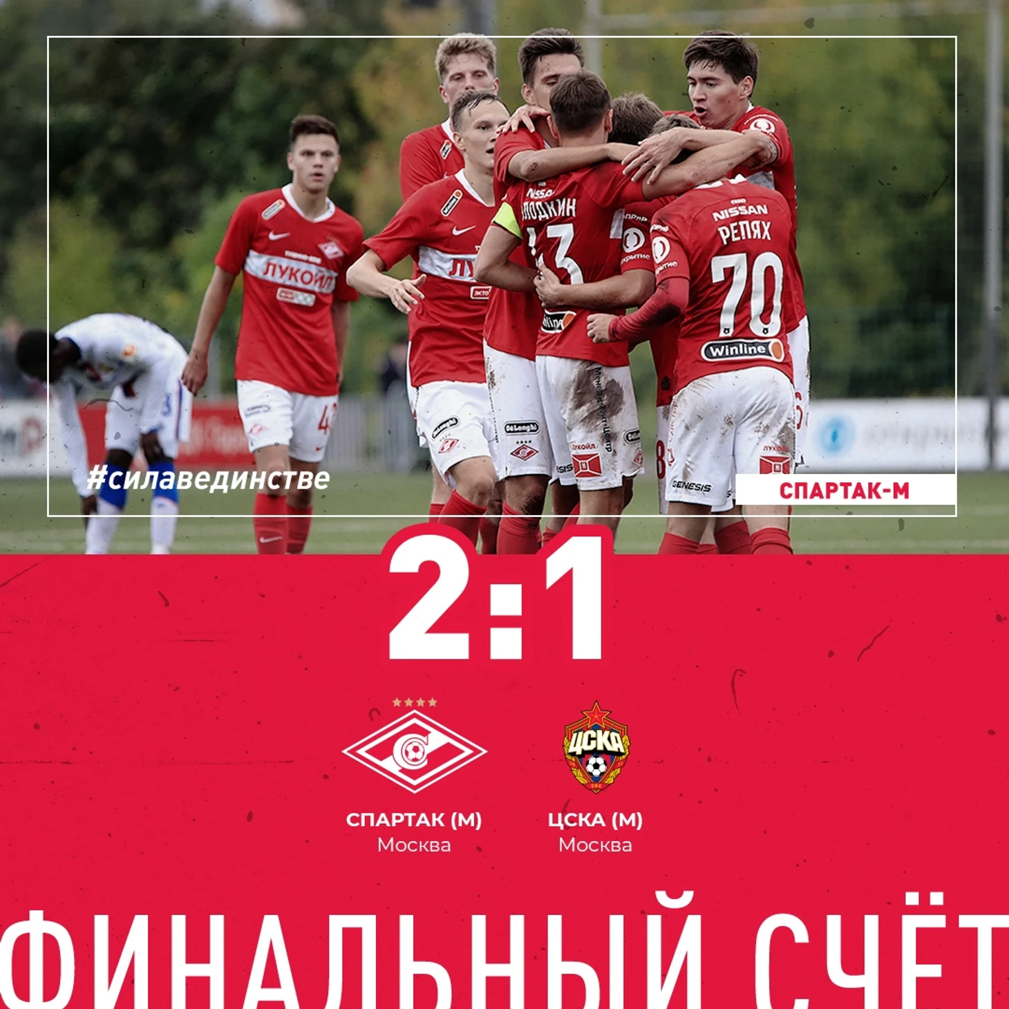 В матче 6-го тура молодёжного первенства России «Спартак» обыграл ЦСКА со счётом 2:1. Встреча состоялась на стадионе академии „Спартак“ имени Фёдора Черенкова. Обслуживал матч Юрий Матвеев из Москвы.
