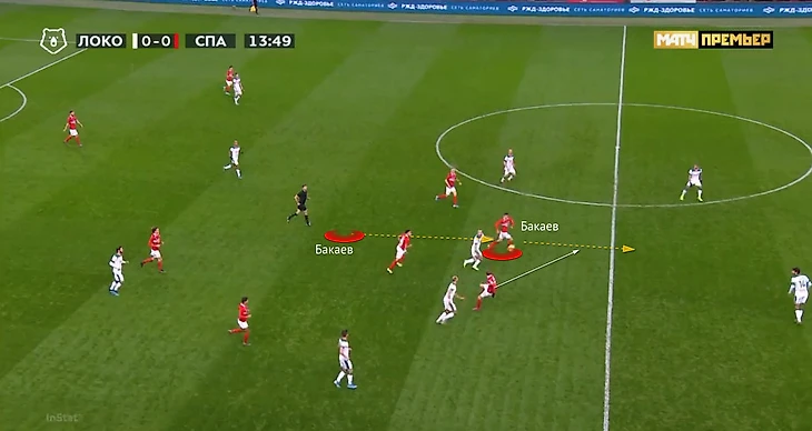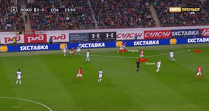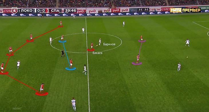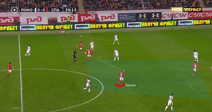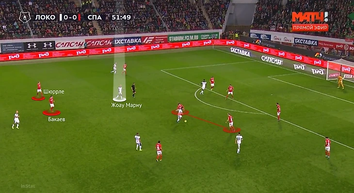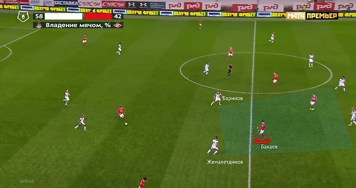 Главное преимущество, полученное «Спартаком» от роли Бакаева в рамках двух противодействующих систем, — Зелимхан смог работать в любимом полуфланге (статистически наименее контролируемом участке поля), при этом не имел прямых оппонентов в 70-80 процентах эпизодов: Жоау Мариу действовал в передней линии прессинга вместе с Эдером и Миранчуком по центральным защитникам и Кралу; Жемалетдинов был вынужден держать широкие включения Мельгарехо, сразу же поднимавшегося при атаке высоко; а Баринов и Крыховяк насыщали центр для недопущения передач между линиями.