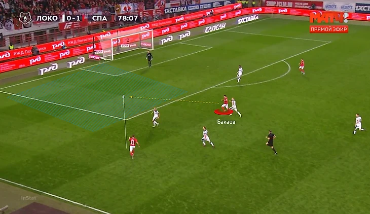 Точно так же Бакаев ворвался в свободный коридор, например при втором голе «Спартака».