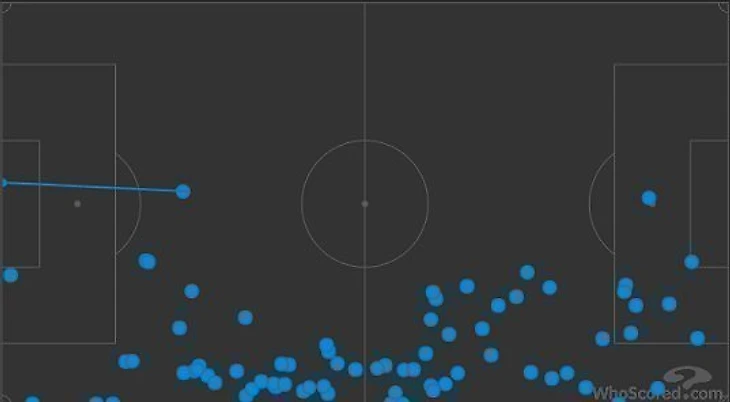 Айртон удачно вписался в новую схему «Спартака» 3-5-2, где в его ведении вся левая бровка. Вот карта касаний бразильца в матче 22-го тура РПЛ против «Оренбурга» (3:1) — она характерна и для остальных игр, в которых защитник перемещается по всему флангу, действуя близко к боковой линии: