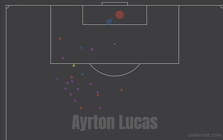 Интересным показателем является среднее количество передач: 41,3 за игру. По этой статистике Айртона опережают центральные защитники, игроки, тяготеющие к правому флангу (Рассказов и Зобнин), а также опорный хавбек Крал. Бразилец явно предпочитает самостоятельно тащить мяч к чужим воротам и бить со смещением в центр. Вот его удары в этом сезоне: