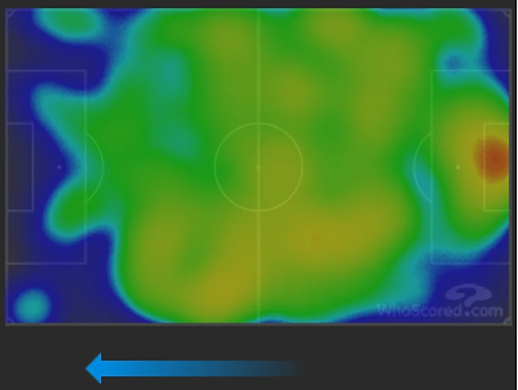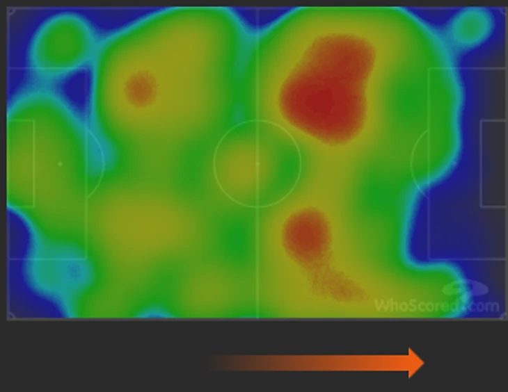 К примеру, вот тепловая карта игроков красно-белых в матче 11-го тура РПЛ против «Оренбурга» (1:2), на которой видна их активность в финальной трети поля (больше красного цвета).