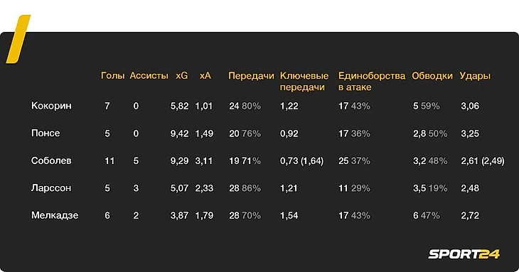 В принципе, ситуация и без цифр была предельно ясна: Кокорина берут в старт, так как он сильнее Ларссона, Понсе и Мелкадзе, Соболев будет играть рядом как игрок нужного Тедеско формата. В теории Джордана можно двигать чуть ниже — к примеру, на позицию Бакаева, но швед не будет давать того объема креатива, что нужен.
