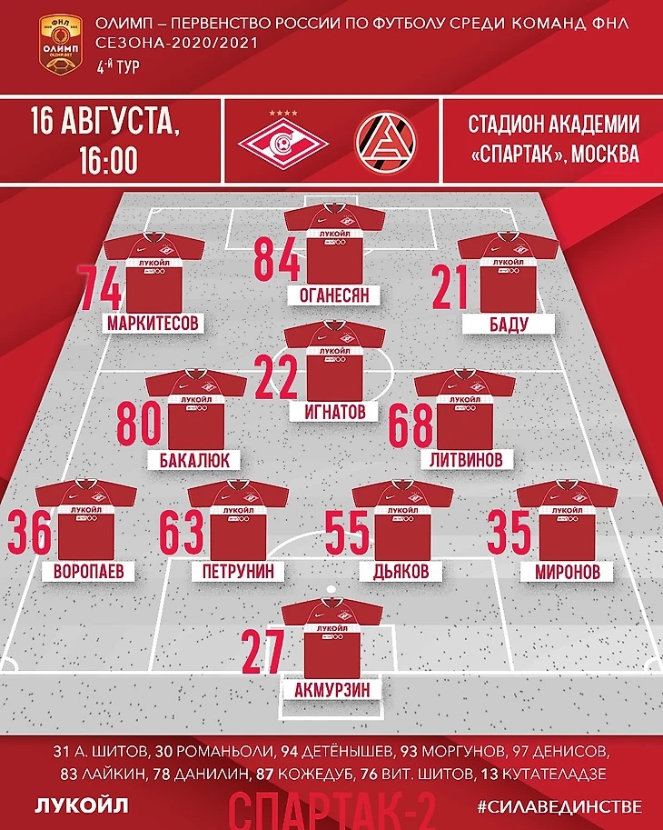 «Спартак-2»: Акмурзин, Миронов, Дьяков (к), Петрунин, Воропаев, Бакалюк, Литвинов, Маркитесов (Кожедуб, 57), Игнатов (Данилин, 73), Баду, Оганесян (Кутателадзе, 88).