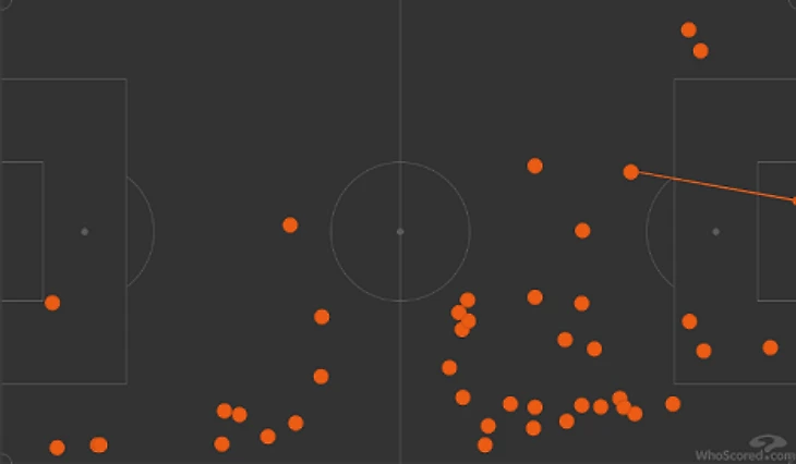 Вот, к примеру, карта касаний Бакаева в матче 1-го тура против «Сочи» (2:2).