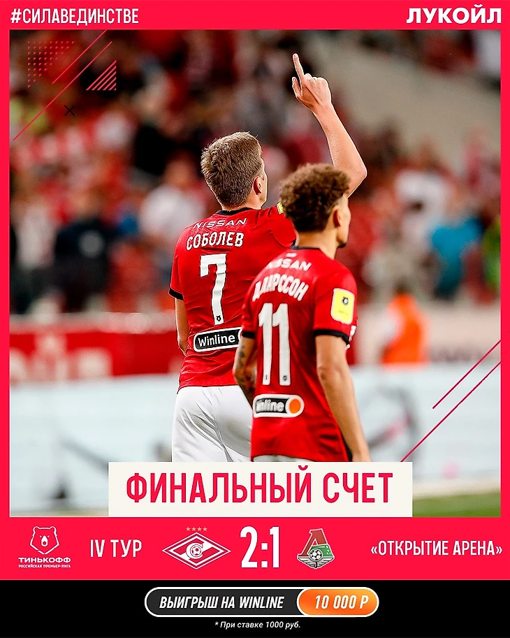 «Спартак» одержал волевую победу над «Локомотивом» в матче 4-го тура Тинькофф РПЛ. Красно-белые взяли верх со счетом 2:1.