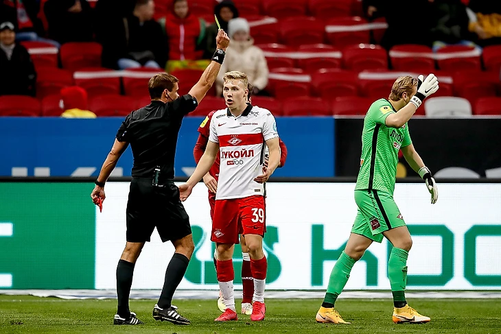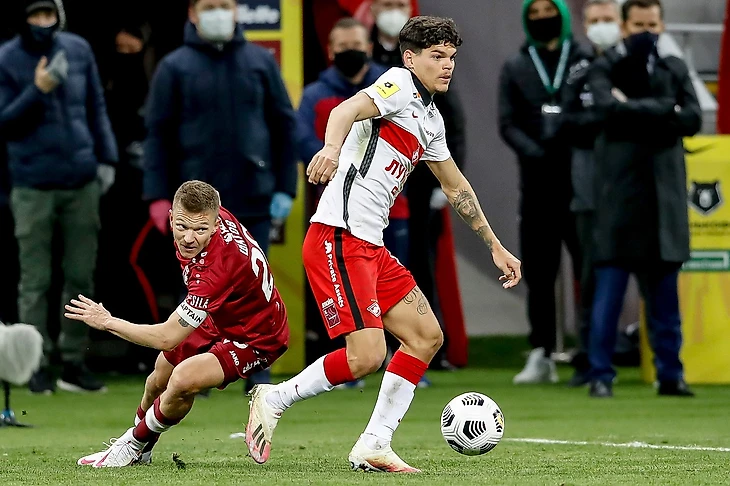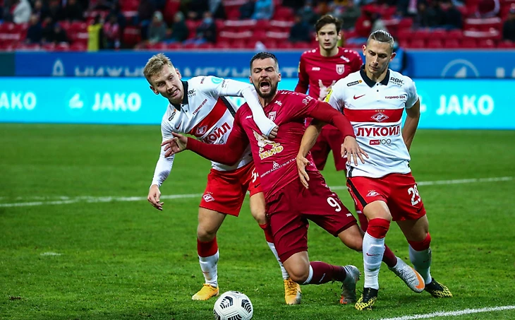 Однако все не так плохо. Во-первых, красно-белые с 61-й минуты играли в меньшинстве из-за удаления Маслова. Во-вторых, второй удар в створ ворот «Рубина» стал автоголевым. Голкипер Медведев исполнил волейбол во вратарской, угодив в Меркулова.