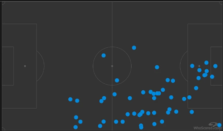 Карта касаний Джикии в матче 8-го тура РПЛ «Рубин» — «Спартак» (0:2)