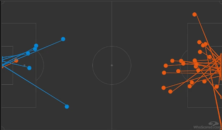 Карта ударов «Спартака» (синий цвет) и «Рубина» (оранжевый цвет) в матче 8-го тура РПЛ (2:0)