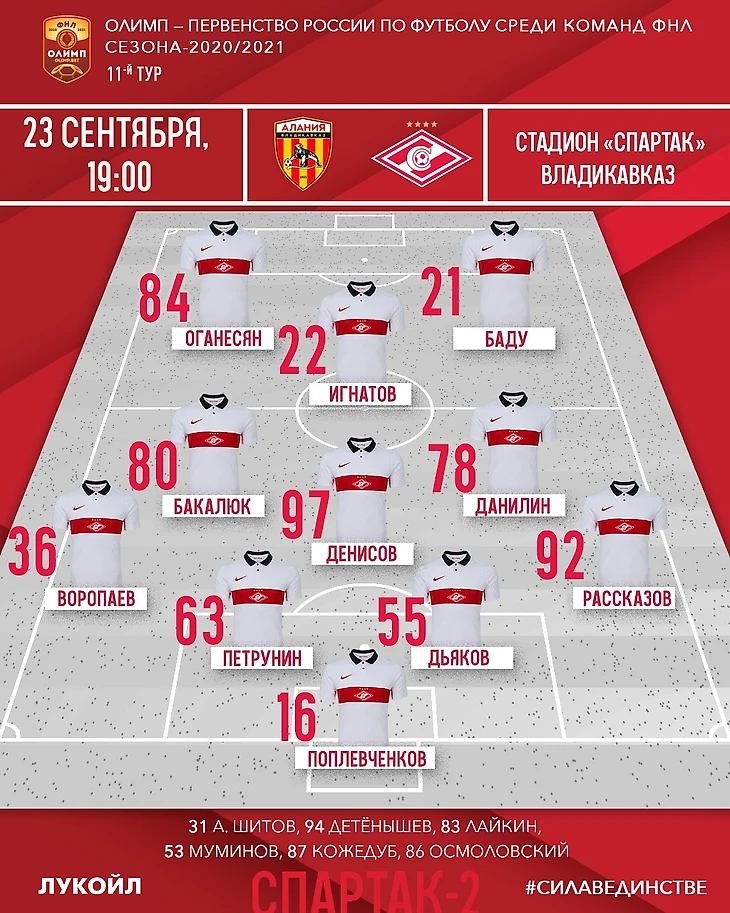 «Спартак-2»: Поплевченков, Рассказов, Дьяков (к), Петрунин, Воропаев (Осмоловский, 82), Денисов, Бакалюк (Лайкин, 68), Данилин (Муминов, 46), Игнатов, Баду (Кожедуб, 68), Оганесян.