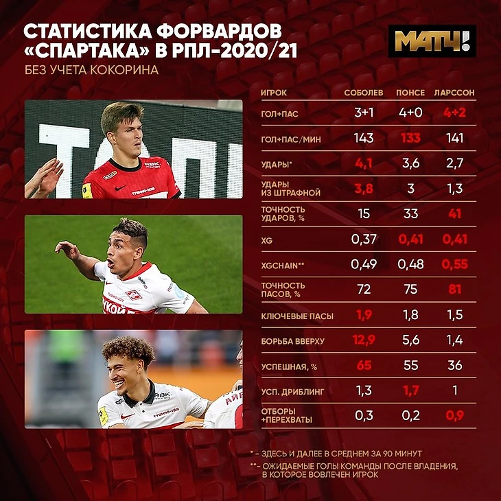 Но прямо сейчас Александр уступает Понсе и Ларссону. Первый качественнее в завершении (при сопоставимых показателях по созданию моментов для себя и партнеров банально лучше реализация), второй играет в другой роли, в оттяжке, поэтому конкурирует с Соболевым только номинально.
