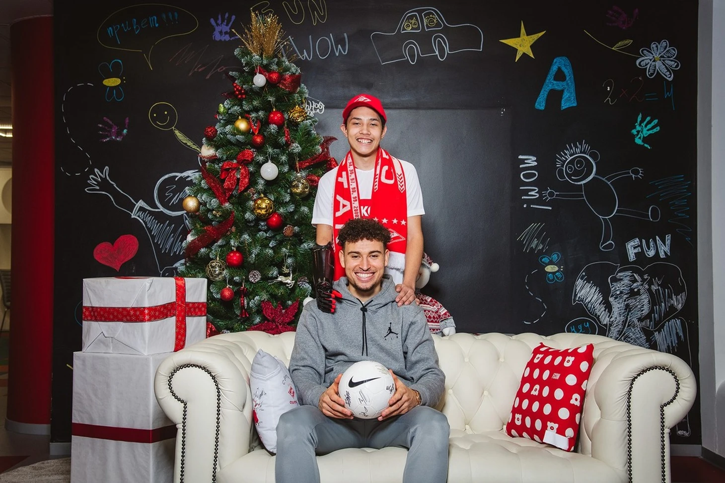 А затем настало время немного встряхнуться и поиграть в футбол. В разминочной зоне домашней раздевалки «Открытие Арены» Дима чувствовал себя уверенно и забил Джордану несколько мячей. В завершение дня наши герои сделали памятные фото в детской комнате в новогодних декорациях и пожелали друг другу крепкого здоровья и много побед!