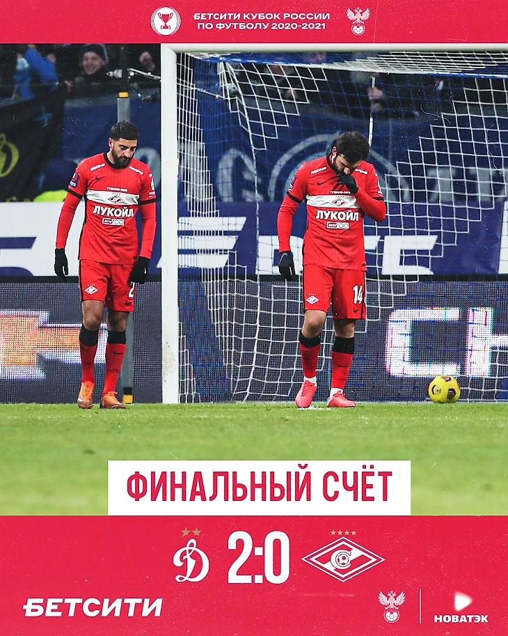 «Динамо» обыграло «Спартак» в 1/8 финала БЕТСИТИ Кубка России — 2:0. Счет на 16-й минуте открыл Даниил Фомин, реализовавший пенальти. В середине второго тайма 18-летний Константин Тюкавин забил второй мяч.