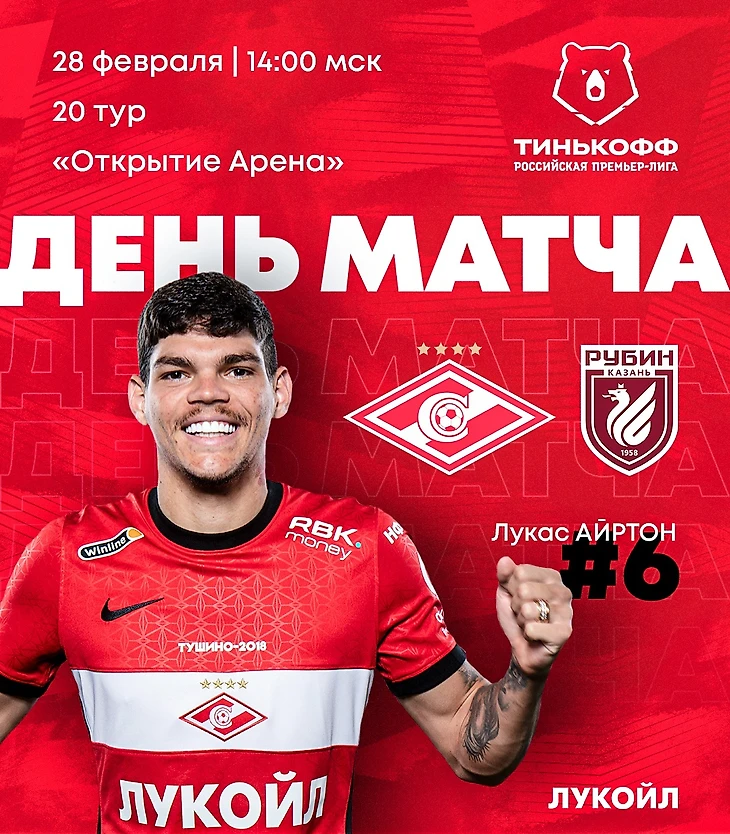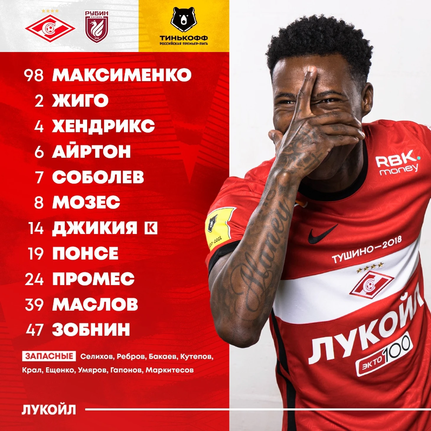 Во встрече 20-го тура Тинькофф Российской Премьер-Лиги против «Рубина» с первых минут сыграют: Максименко, Маслов, Джикия (к), Жиго, Айртон, Хендрикс, Зобнин, Промес, Мозес, Соболев, Понсе.