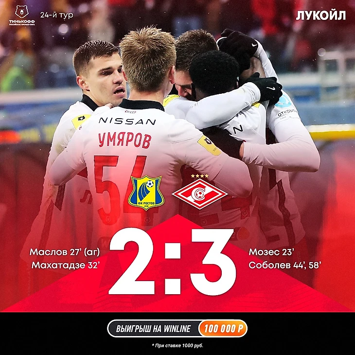 «Спартак» в гостевом матче 24-го тура Тинькофф РПЛ обыграл «Ростов» (3:2).