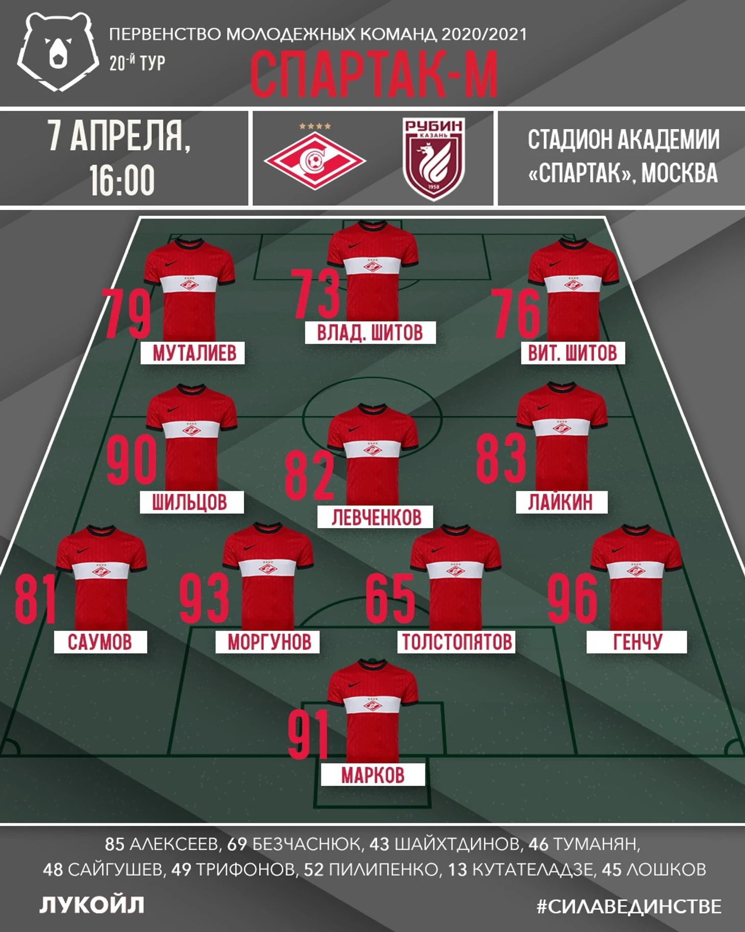 Состав. Дубль получил усиление в лице находящихся в обойме «Спартака-2» Константина Шильцова и Владислава Шитова, которые в этом году в молодежном первенстве еще не играли. Кроме того, после дисквалификации в состав вернулся Аслан Муталиев.