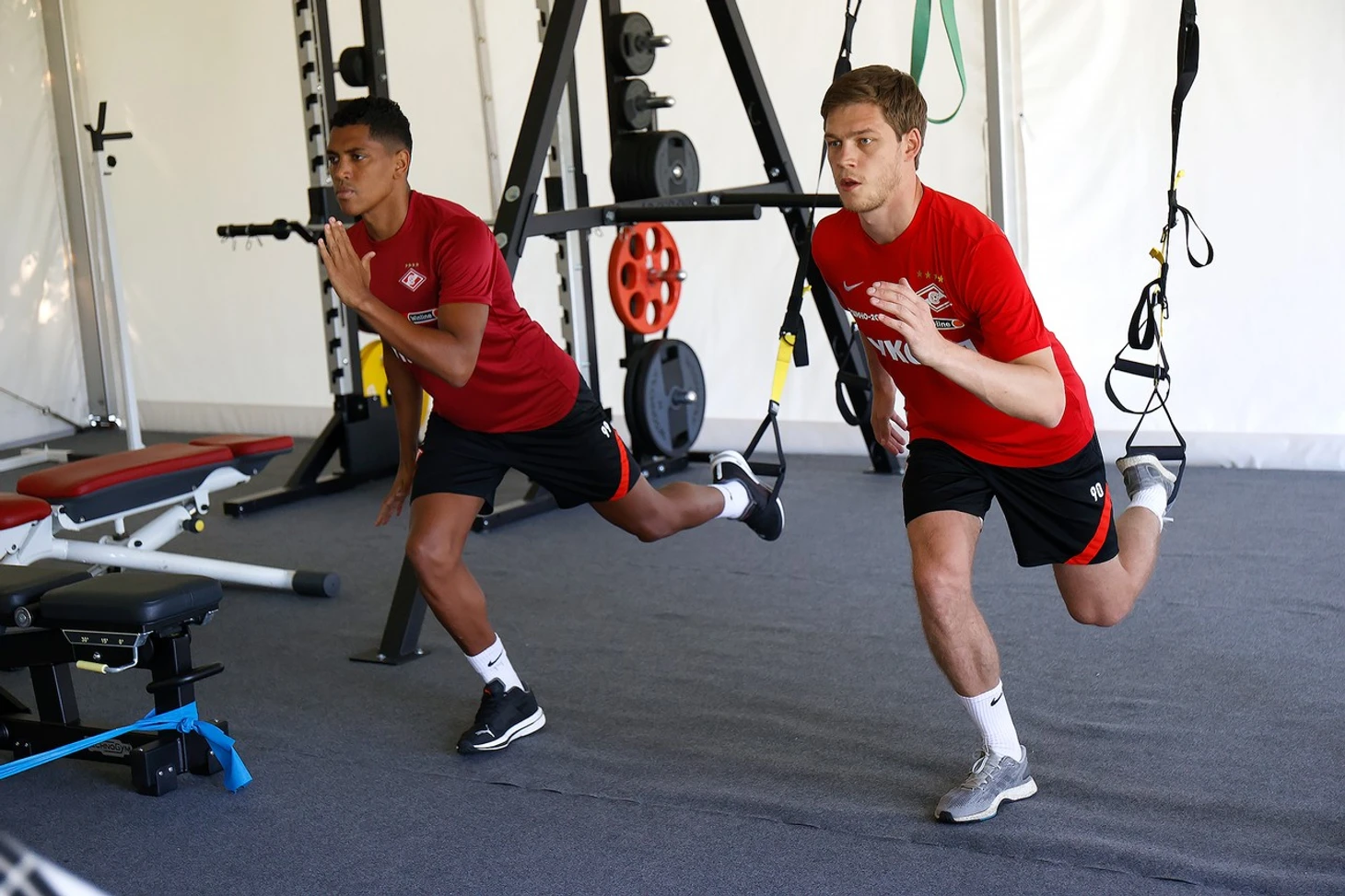 Рабочий день начался для команды с разминки в новом тренажерном зале. Он разместился в специальном шатре около одного из полей.