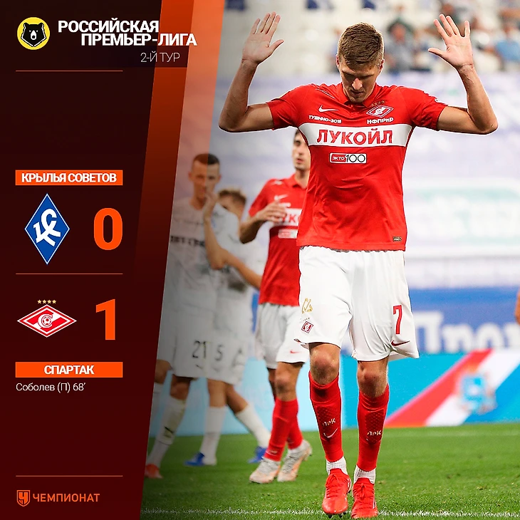 Гости выигрывали воздух в штрафной «Крыльев Советов». Соболев продавливал центральных защитников хозяев после подач, Жиго – кого угодно на стандартах, которые на сегодняшний день едва ли не самое мощное оружие команды Витории. Благодаря угловому красно-белые и заработали пенальти. «Точка» очевидная, так как мяч попал в выставленную руку Божина. Правда, игроки «КС» утверждали, что углового не было, поскольку мяч ушёл от спартаковца. Соболев, реализовав одиннадцатиметровый, не стал праздновать. Напротив, извинился жестом перед Самарой. Поступок достойный уважения.