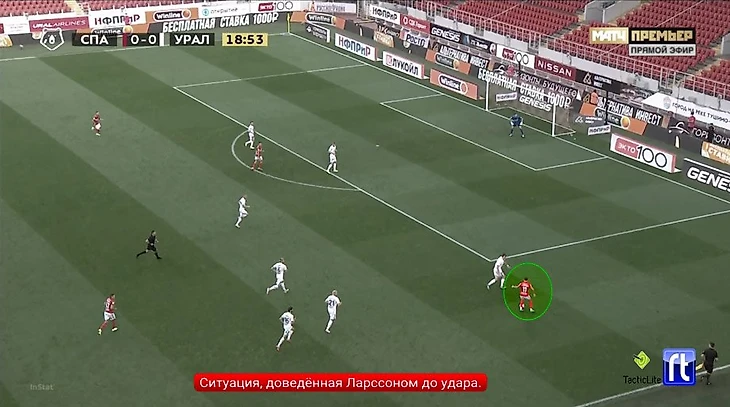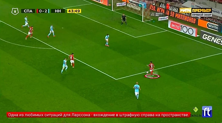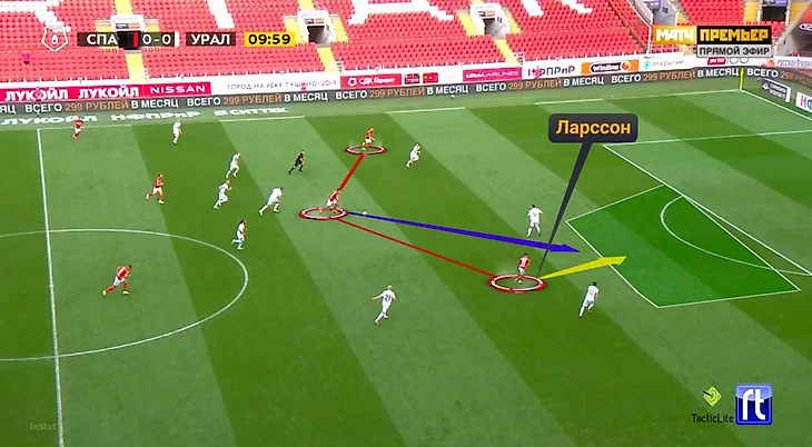 2) При позиционной атаке «Спартак» перестраивался на 3-4-3: Ломовицкий поднимался из опорной зоны на левый фланг, Ларссон смещался правее – мог ситуативно уходить в ширину, а мог открываться на линии офсайда в передней линии. И пространства он часто имел гораздо больше, чем между линиями при 4-4-1-1.