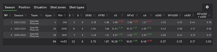 В прошлом сезоне швед наносил за 90 минут в РПЛ в среднем 2,84 удара. Сейчас на короткой дистанции – 2,78. Показатель ожидаемой результативности без учёта пенальти NPxG90 упал, но незначительно (0,38 против 0,33, спасибо последней игре с «Уралом» — к ней мы ещё вернёмся). По касаниям в штрафной сейчас даже немного лучше – было 3,82, стало 4,09. Единоборства, дриблинг, заработанные фолы – по этим метрикам также нет явного проседания.