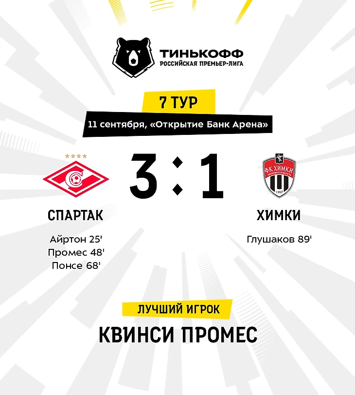 В итоге первый гол организовали не форварды, а крайние защитники: Рассказов набрал скорость, получил мяч от Соболева, дошел до линии ворот и прострелил во вратарскую, откуда Айртон в касание переправил мяч в сетку. Перед перерывом «Спартак» мог нарваться на неприятности, но Максименко отразил сильный удар Кухарчука, а гол, который химчане забили следом, не был засчитан из-за офсайда.
