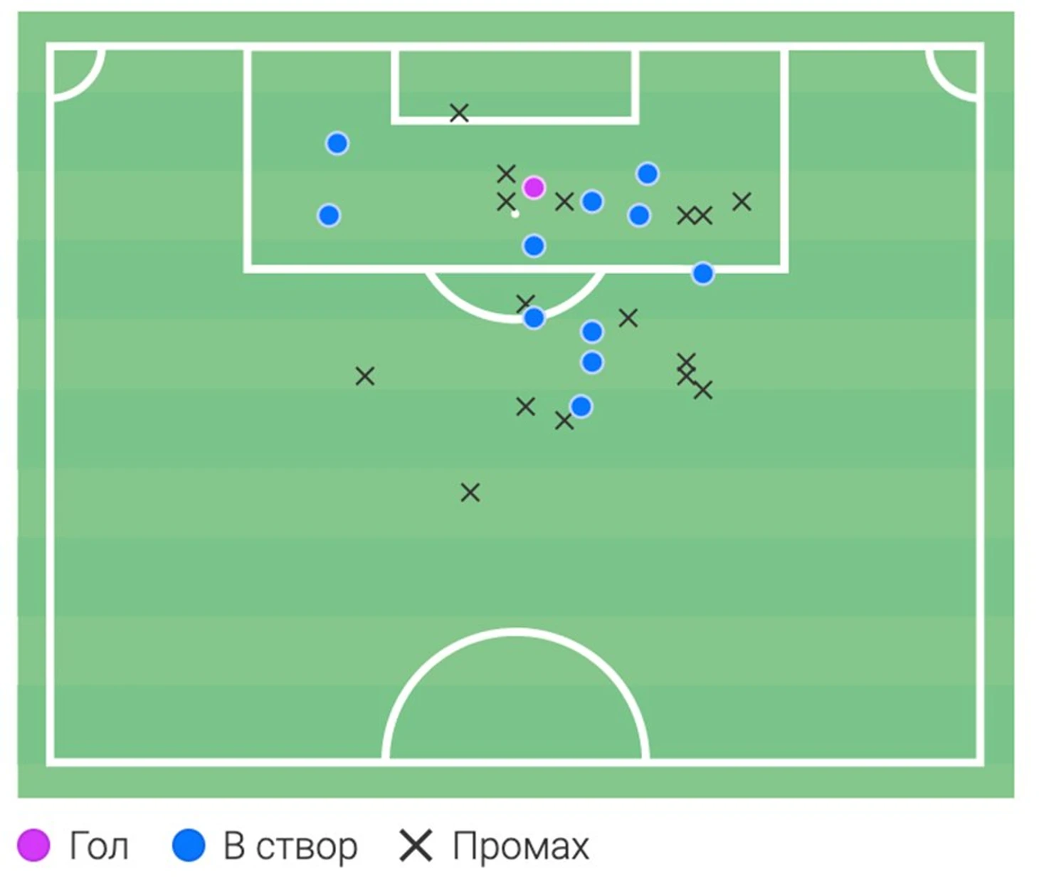 А ниже – карта ударов прошлого сезона. Концентрация точек внутри самой опасной зоны штрафной значительно выше.