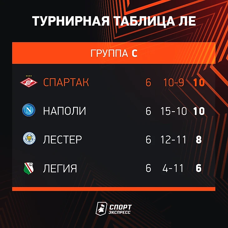 "Спартак" гарантировал себе участие в плей-офф Лиги Европы, у команды 10 очков. Параллельно прошел матч "Наполи" и "Лестера". "Наполи" одержал победу со счетом 3:2 и набрав 10 очков занял второе место в группе С. Учитывая этот результат, "Спартак" остается лидером группы и продолжит выступление в 1/8 финала Лиги Европы.
