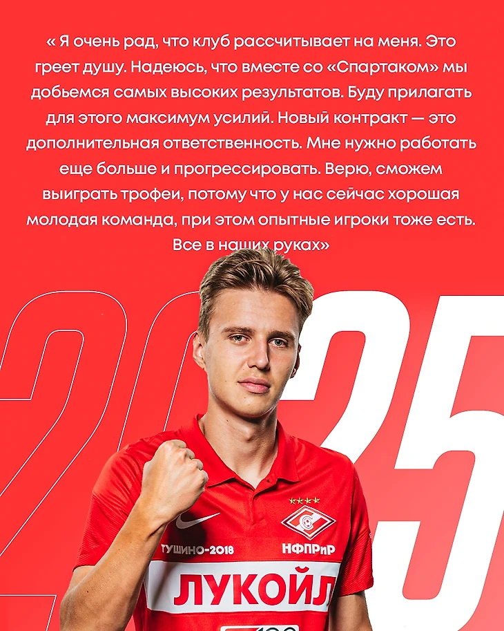 — Я очень рад, что клуб рассчитывает на меня, — сказал Игнатов. — Это греет душу. Надеюсь, что вместе со «Спартаком» мы добьемся самых высоких результатов. Буду прилагать для этого максимум усилий. Новый контракт — это дополнительная ответственность. Мне нужно работать еще больше и прогрессировать. Верю, сможем выиграть трофеи, потому что у нас сейчас хорошая молодая команда, при этом опытные игроки тоже есть. Все в наших руках.