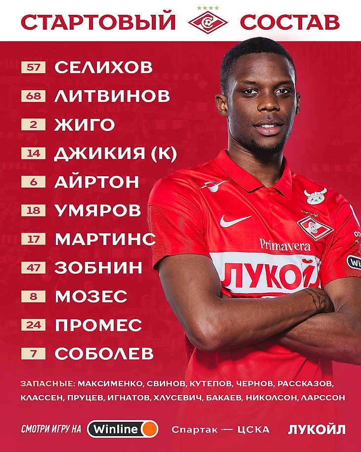 С первых минут на поле «Открытие Банк Арены» сыграют: Селихов, Литвинов, Жиго, Джикия (к), Мозес, Айртон, Умяров, Зобнин, Мартинс, Промес, Соболев.