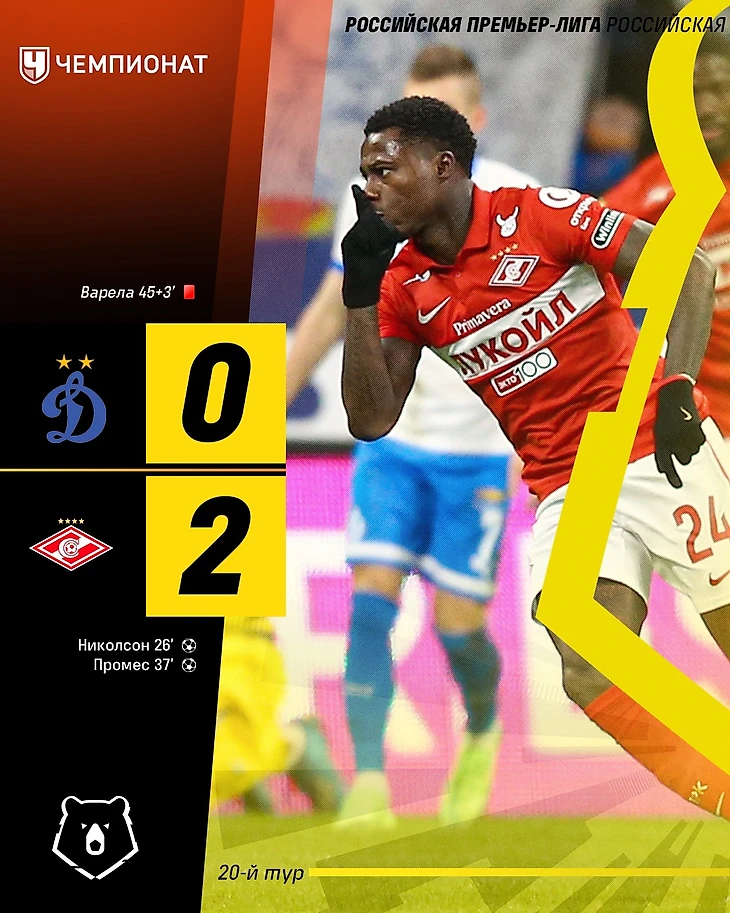 Кстати, по ударам в створ «Спартак» выигрывал к перерыву как раз 2:0 (по общему количеству тоже вёл 6:4). Стопроцентная реализация! Вдобавок ко всем бедам бело-голубых Варела заработал удаление за две жёлтые карточки в течение шести минут.