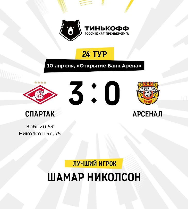 Сразу после перерыва в игре все резко изменилось. «Спартак» начал забивать! Неожиданно первым это сделал Зобнин, который до перерыва не выглядел очень активным. А тут откликнулся на передачу Игнатова, который несколько раз в этом матче пробовал выводить на хорошие позиции своих партнеров, действуя весьма эффективно. На сей раз все сработало: Зобнин ударил и забил! Пяти минут не прошло, как спартаковцы забили и второй мяч. Сработала связка двух форвардов: Соболева и Николсона. Соболев отдал передачу партнеру, Николсон на сей раз сделал все правильно: он не стал забираться в положение вне игры, принял передачу Соболева, и справа точно ударил в дальний левый угол ворот «Арсенала». Тут уже Левашов ничего не мог поделать. Хотя играл он в этот день отлично. И, если бы не его действия, спартаковцы могли бы забить гораздо больше. Правда, дублю Николсона чуть позже, и он помешать все же не смог. Николсон очень хорошо поймал мяч на ногу после отскока от головы защитника туляков и сходу пробил: без шансов для Левашова – 3:0!