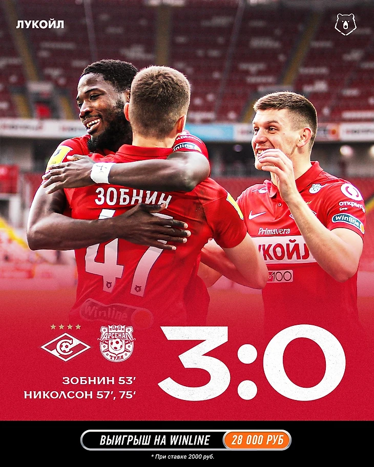 Голы: 1:0 Зобнин (53, Игнатов). 2:0 Николсон (57, Соболев). 3:0 Николсон (75).