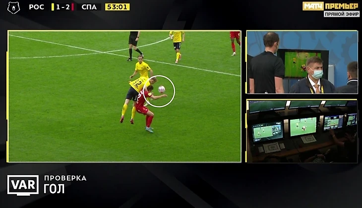 После перерыва история повторилась. Снова сработала связка Бакаев — Игнатов (Зелимхан, получив мяч от Соболева, выдал просто идеальный пас между защитников). И снова в дело вмешался ВАР: выяснилось, что в начальной стадии атаки, то есть задолго до того, как выскочить на ударную позицию, Михаил коснулся мяча рукой.