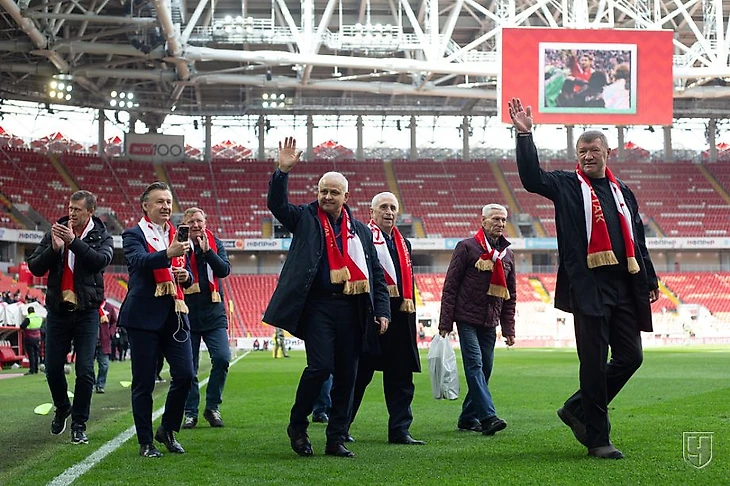 Игроки «Спартака» вышли на поле в олдскульных футболках без спонсоров, с ромбом без футбольного мяча и с фамилиями клубных легенд. А затем почтили минутой молчания память последних. Ещё одна фишка — узор на газоне в виде ромбов и число 100 в центральном круге.