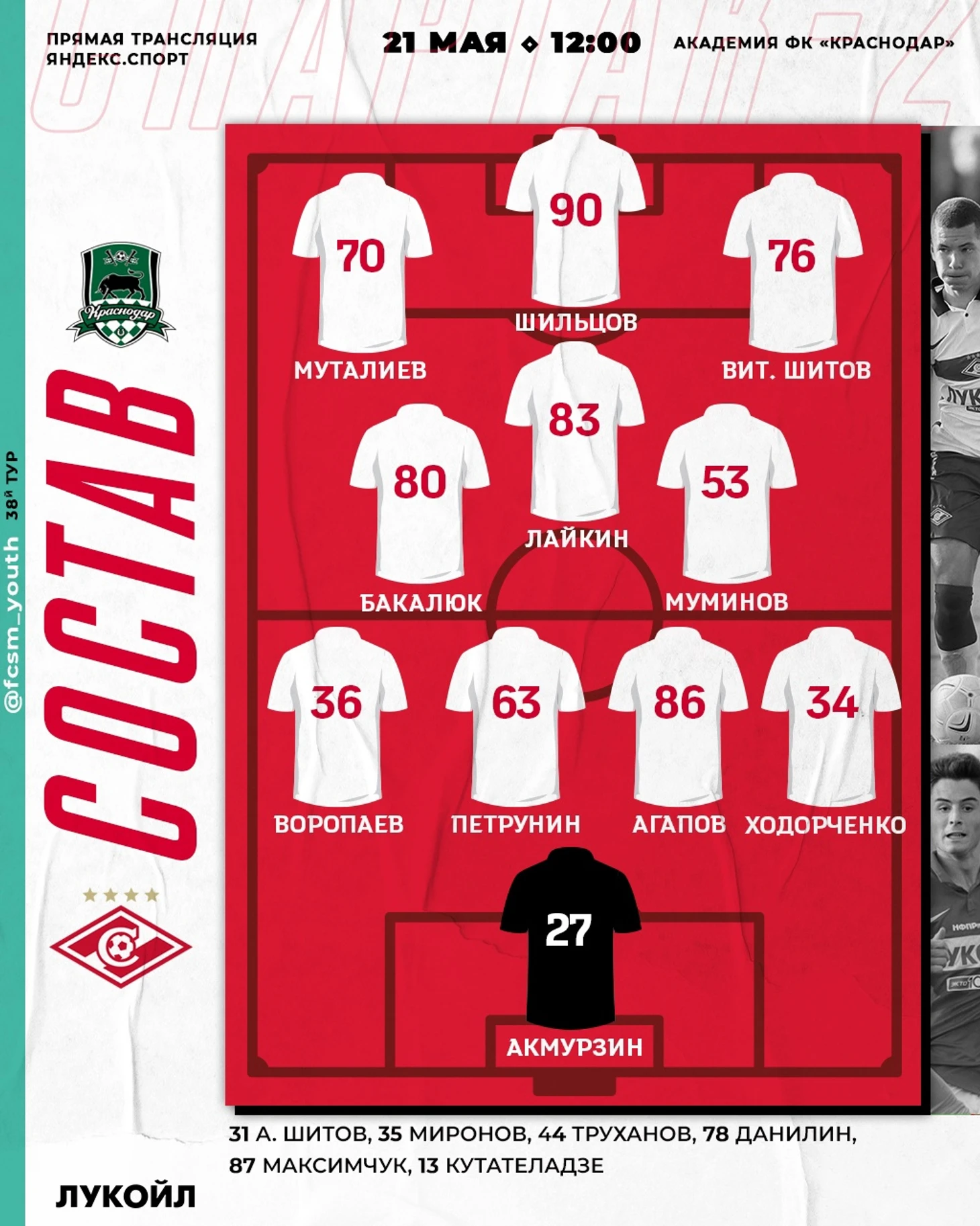 «Спартак-2»: Акмурзин, Ходорченко (Миронов, 88), Агапов, Петрунин, Воропаев (к), Вит. Шитов, Бакалюк (Кутателадзе, 72), Муминов, Муталиев, Лайкин, Шильцов (Максимчук, 81).