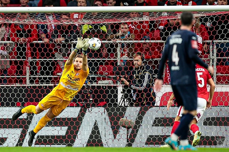 Гол не расслабил «Спартак» — моменты возникали только у красно-белых. Так было вплоть до 16-й минуты, когда Александру Максименко пришлось тащить после выхода один на один.