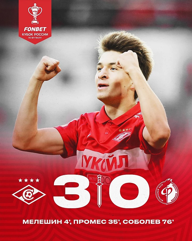 Голы: 1:0 Мелёшин (4). 2:0 Промес (34, Игнатов). 3:0 Соболев (75, Джикия).