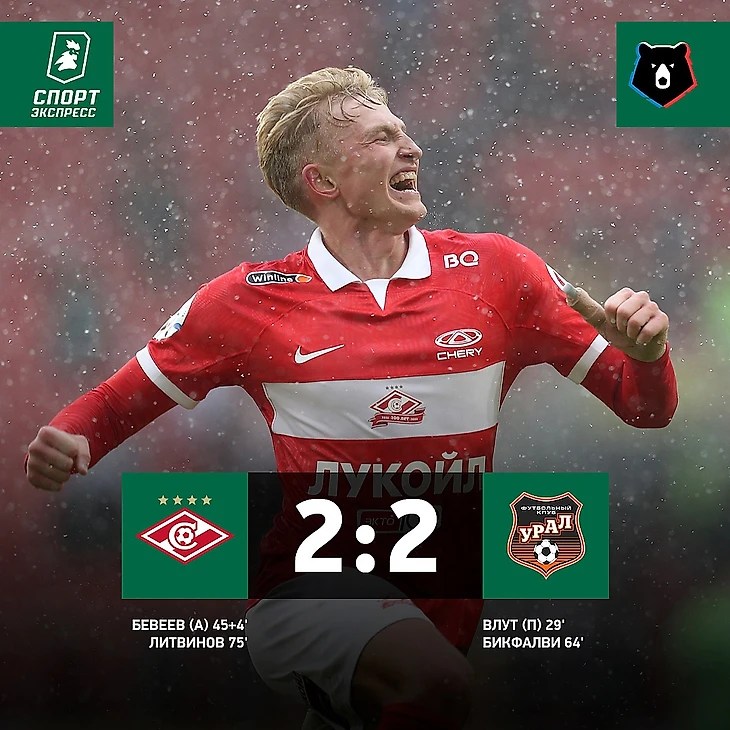 «Спартак» сыграл вничью с «Уралом», Литвинов оформил дубль