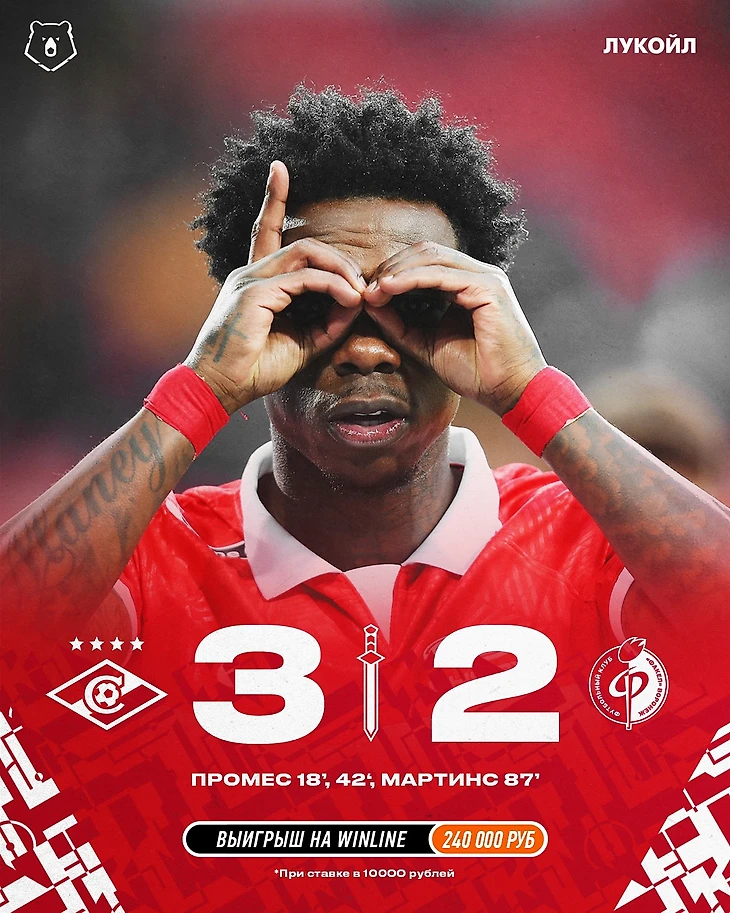 КРАСНО-БЕЛЫЕ ОДЕРЖАЛИ НЕПРОСТУЮ ПОБЕДУ НАД КЛУБОМ ИЗ ВОРОНЕЖА. В ПЕРВОМ ТАЙМЕ ПРОМЕС ЗАБИЛ 100-Й И 101-Й ГОЛЫ ЗА «СПАРТАК», НО МЫ ПОЗВОЛИЛИ СОПЕРНИКУ БЫСТРО СРАВНЯТЬ СЧЕТ. РЕШАЮЩИМ СТАЛ ТОЧНЫЙ УДАР МАРТИНСА В КОНЦОВКЕ ВСТРЕЧИ.
