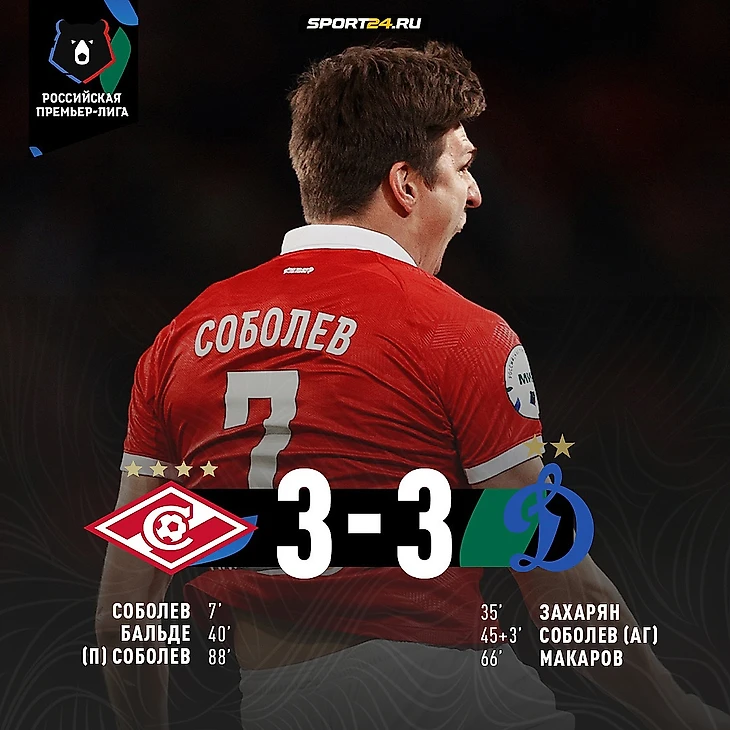 «Спартак» и «Динамо» сыграли вничью. Соболев оформил дубль и забил в свои ворота