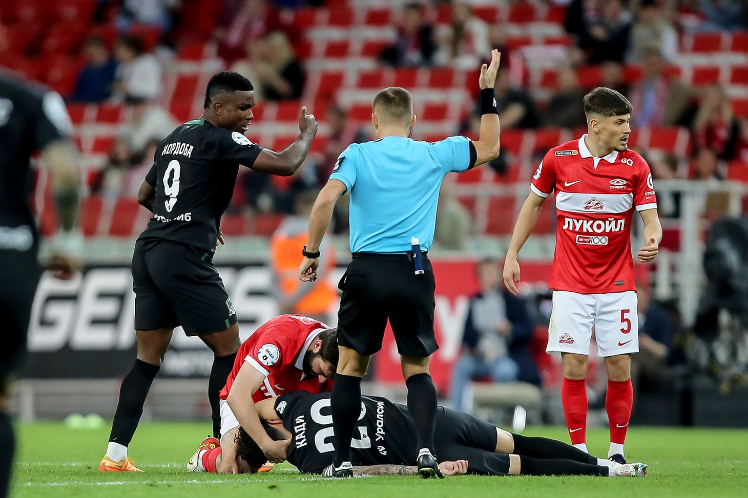 Вторая половина началась с неприятного момента: Джикия и Кади столкнулись головами в центре поля, после чего игрок гостей рухнул на газон. Капитан «Спартака» тут же бросился к сопернику, чтобы у того не запал язык. Бразильцу долго оказывали помощь врачи, после чего погрузили на носилки.