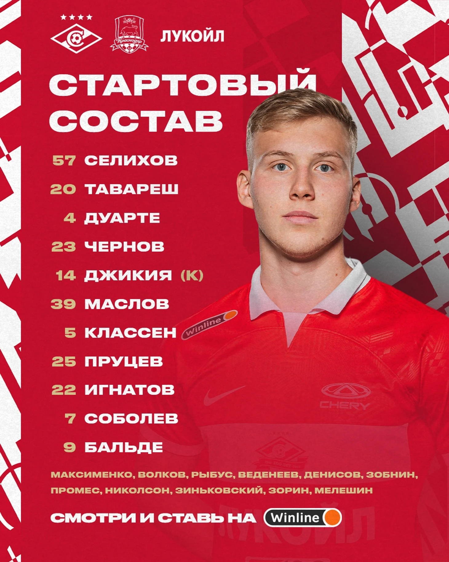 «Спартак»: Селихов, Тавареш, Дуарте, Чернов (Зобнин, 43), Джикия (к), Классен, Маслов (Николсон, 80), Пруцев (Денисов, 46), Игнатов (Зиньковский, 64), Соболев, Бальде (Промес, 46).