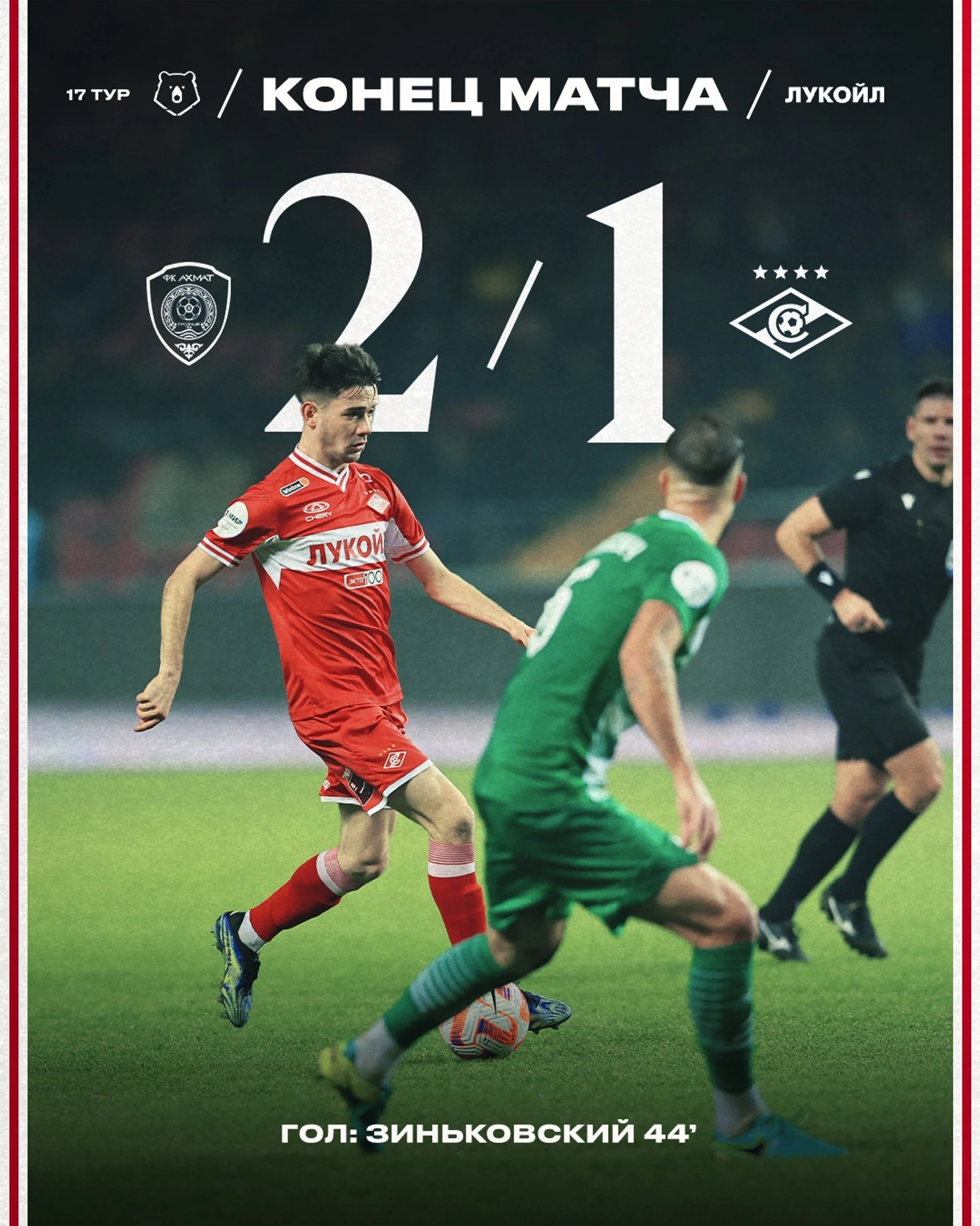 «Ахмат» на своем поле обыграл «Спартак» в матче 17-го тура РПЛ — 2:1.
